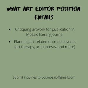 Since 1959, Mosaic has connected readers and writers from across the world. Based on the campus of the University of California, Riverside, Mosaic is staffed by undergraduates who are passionate about writing and art.